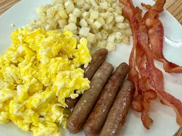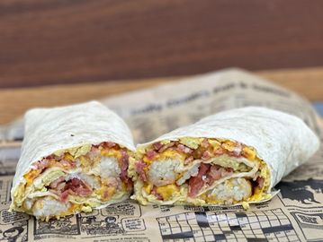 Tater Tots, Scrambled Eggs, Your Choice of Bacon, Sausage, or Ham. Cheese and Veggies of your choice.