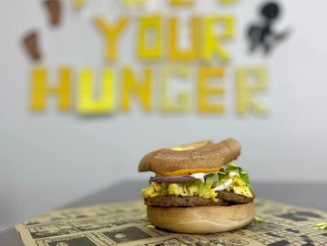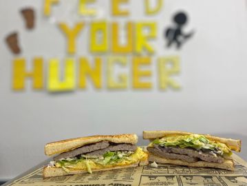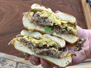 2 Eggs, Slab of Steak, Onion, Mushroom, Green Pepper, Choice of Cheese, on Bagel