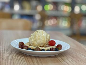 Stack of 2 Waffles or Pancakes, Topped with Choice of Ice Cream and syrup