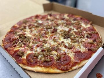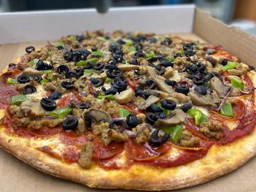 Marinara Sauce loaded with Mozzarella Cheese and Pepperoni, Sausage, Green Peppers, Black Olives, Banana Peppers, Onions, Mushrooms.