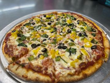 Marinara Sauce loaded with Mozzarella Cheese and your Favorite Veggies. Green Peppers, Onions, Mushrooms, Black Olives, Jalapenos, Tomatoes, Spinach, Banana Peppers.